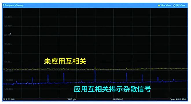 图3中蓝色迹线为互相关检测器测量结果,对比黄色RMS检测器迹线 MHz分辨率带宽(RBW)条件下,RMS检测器几乎无法识别杂散信号——甚至完全不可见。