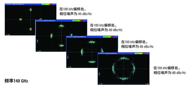 图2展示了当相位噪声增加时,一个采样率为20 MHz的QPSK信号性能如何下降。在100 kHz偏移处,相位噪声为-95 dBc/Hz时,星座图非常清晰。然而,随着相位噪声的增加,信号质量会恶化。在-80 dBc/Hz时,从信号中解码正确的数据变得相当困难。系统必须退回到BPSK调制, 这会降低数据速率。对于QPSK,至少需要-90 dBc/Hz的相位噪声性能,这在140 GHz的中心频率下是非常具有挑战性的。这说明了需要具有互相关能力的仪表来准确测量相位噪声,从而优化振荡器和合成器。