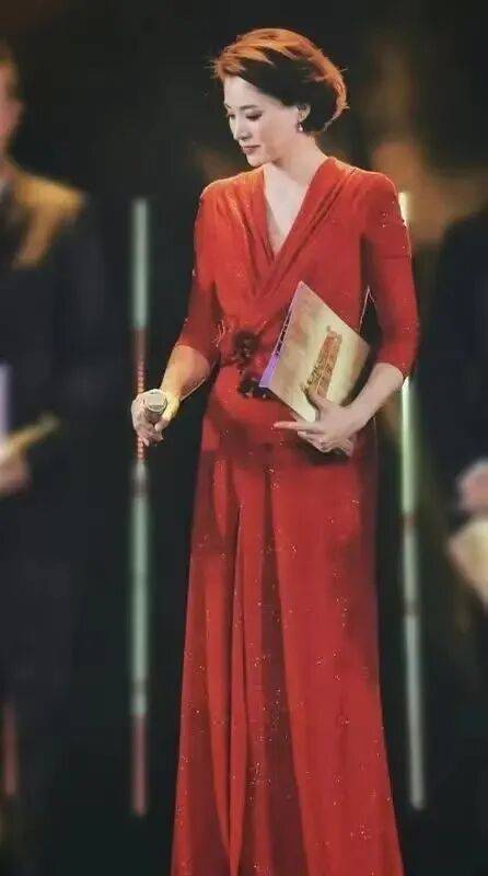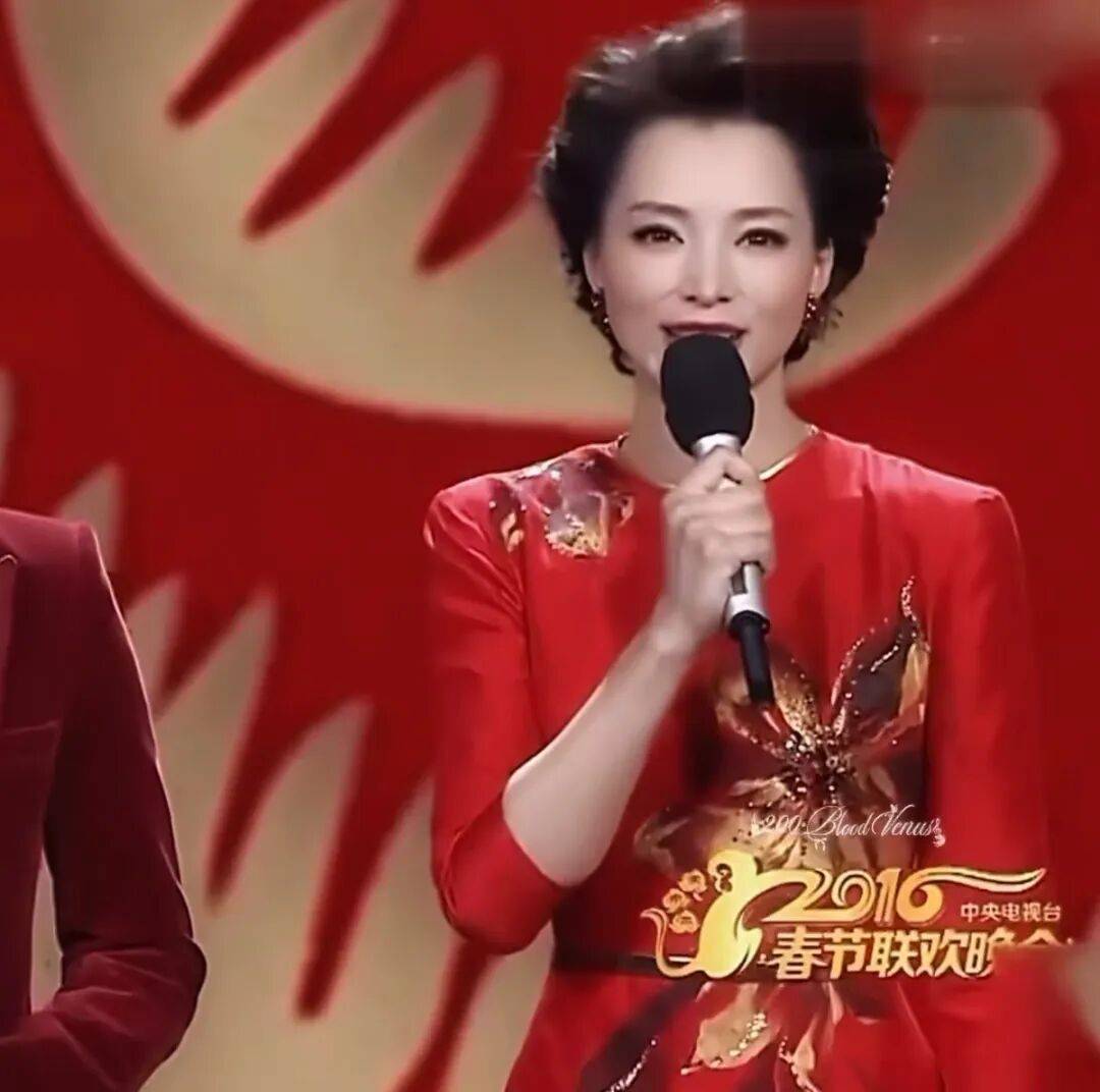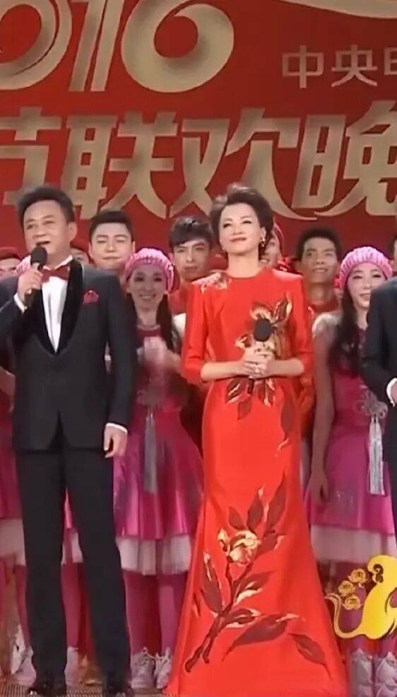 这是她在2016年的春晚造型,红色充满了春节喜气洋洋的氛围,身上的绣花图案,增加了优雅华丽感,而连衣裙又适当的留白,给人以想象的空间。